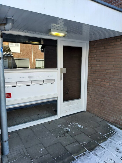Centrale entree met bellentableau, beveiligde deur met intercom en doorgang naar hal met trappenhuis, achteringang en gemeenschappelijke berging (ca. 15m²).
