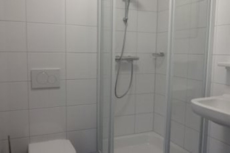 Aan de linkerzijde van de keuken treft u de mooie badkamer, inclusief grote douche, hangend toilet, wastafel, spiegel met licht en een designradiator.