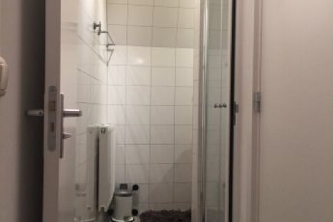 Aan het einde van de keuken is de badkamer gevestigd. Deze badkamer is net verbouwd en daardoor in nieuw staat. De badkamer beschikt over een luxe wastafel met meubelen verlichting, design radiator en een ruime douche. Het totale oppervlakte betreft 3.5m². Naast de badkamer is de toilet te vinden. De toilet is ongeveer 1m² groot.