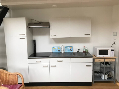 Door de vele ramen in de woonkamer van 19 m2 is er veel lichtinval en een prachtig uitzicht op de tuin. In de open keuken vind u een 4-pits keramische kookplaat, koel- en vrieskast, spoelbak met fontein, afzuiging en opbergruimte in de 3 boven- en 3 onderkasten.