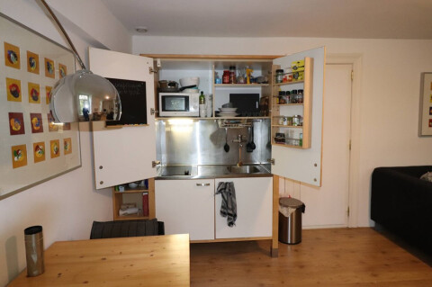 De volledig ingerichte keuken met 2 pits ceramische kookplaat, afwasbak met fontein, afzuiging en magnetron bevindt zich in de woonkamer en is ingebracht in een uitklapbare kast.