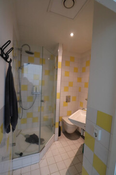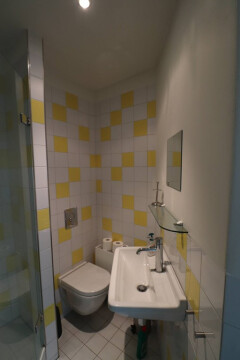 De badkamer is voorzien van een douche, toilet, wasbak met fontein, afzuiging en kastjes.
