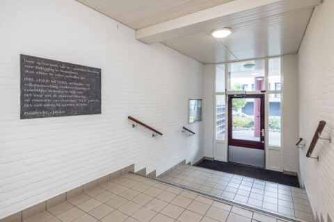 Entree met bellentableau en brievenbussen, centrale hal en lift.