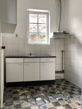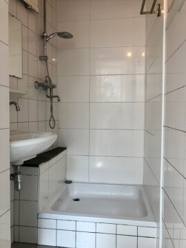Gezamenlijke inkomsthal (te delen met 1 ander appartement), van waaruit de woonkamer te bereiken is. Achter de woonkamer bevindt zich de eenvoudige keuken die wel nog wordt voorzien van een nieuw fornuis en een nieuwe koel-vries combinatie. Vanuit de keuken is de douche ruimte te bereiken, alsook een portaal (met wasmachine aansluiting) welke naar het separate toilet leidt.