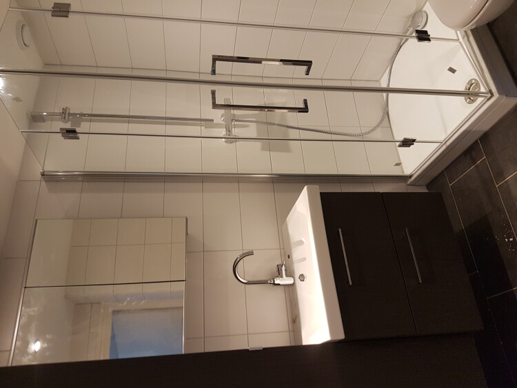 De badkamer is uitgerust met een badkamermeubel, inbouwtoilet en nieuwe douche met harmonica deuren. Ook zitten hier de aansluitingen voor wasmachine en droger.