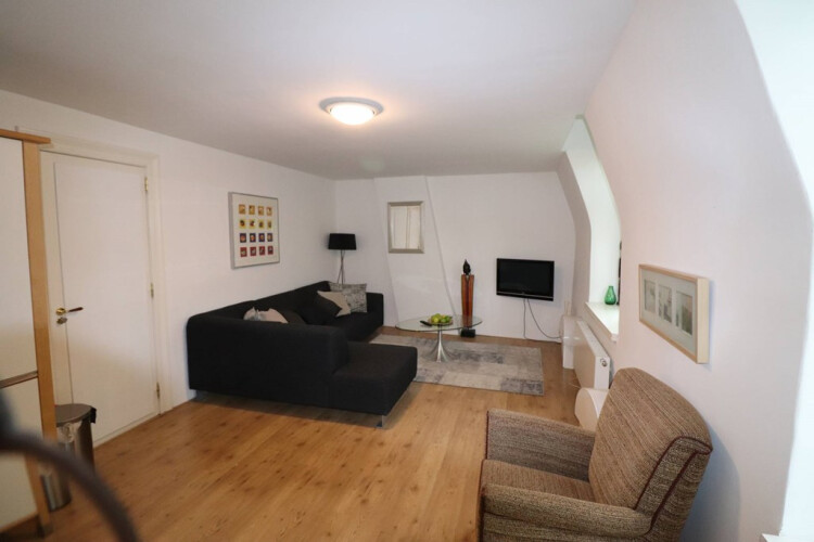 Bij binnenkomst op de overloop grenst aan de rechterzijde de slaapkamer en aan de linkerzijde (voorzijde) de gezellige ingerichte woonkamer die bestaat uit: kast, tapijt, flat screen-tv, bank, tafel + 2 stoelen, bijzet tafels, lampen en koffiezetapparaat.