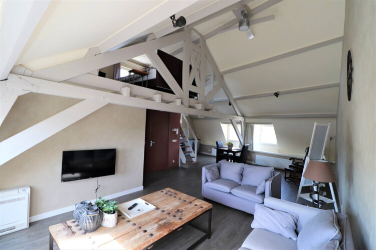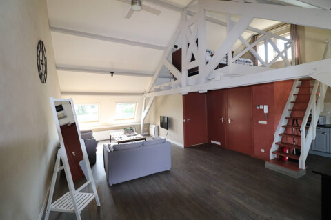 Vanaf de voordeur bevindt zich links de luxe badkamer met inloopdouche(ca. 6m2), een garderobe(3m2) en de grote woonkamer met open keuken(ca. 42 m2). Bereikbaar via een vaste trap bevindt zich ten slotte de karakteristieke slaapkamer (vide 12m2) met een uitkijkt over de landerijen van Gronsveld.