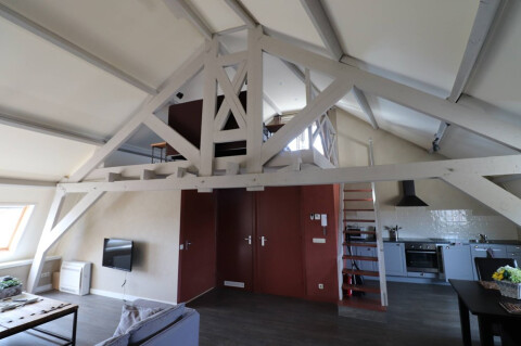 Vanaf de voordeur bevindt zich links de luxe badkamer met inloopdouche(ca. 6m2), een garderobe(3m2) en de grote woonkamer met open keuken(ca. 42 m2). Bereikbaar via een vaste trap bevindt zich ten slotte de karakteristieke slaapkamer (vide 12m2) met een uitkijkt over de landerijen van Gronsveld.