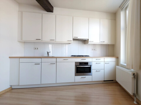 Het appartement is op de 1ste verdieping gelegen van een goed onderhouden pand. De woonkamer met moderne open keuken (7.50m x 4.23m) is v.v. een combi oven, 4 pits gasfornuis, afzuiging, vaatwasser en koelkast met vriesvakje.
